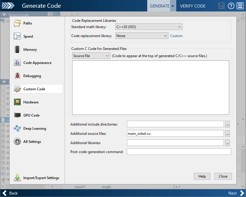 [生成されたファイルのカスタム C コード] の [カスタム コード] タブで、[追加ソース ファイル] を main_sobel.cu に設定します。[閉じる] をクリックして [コードの生成] ページに進みます。