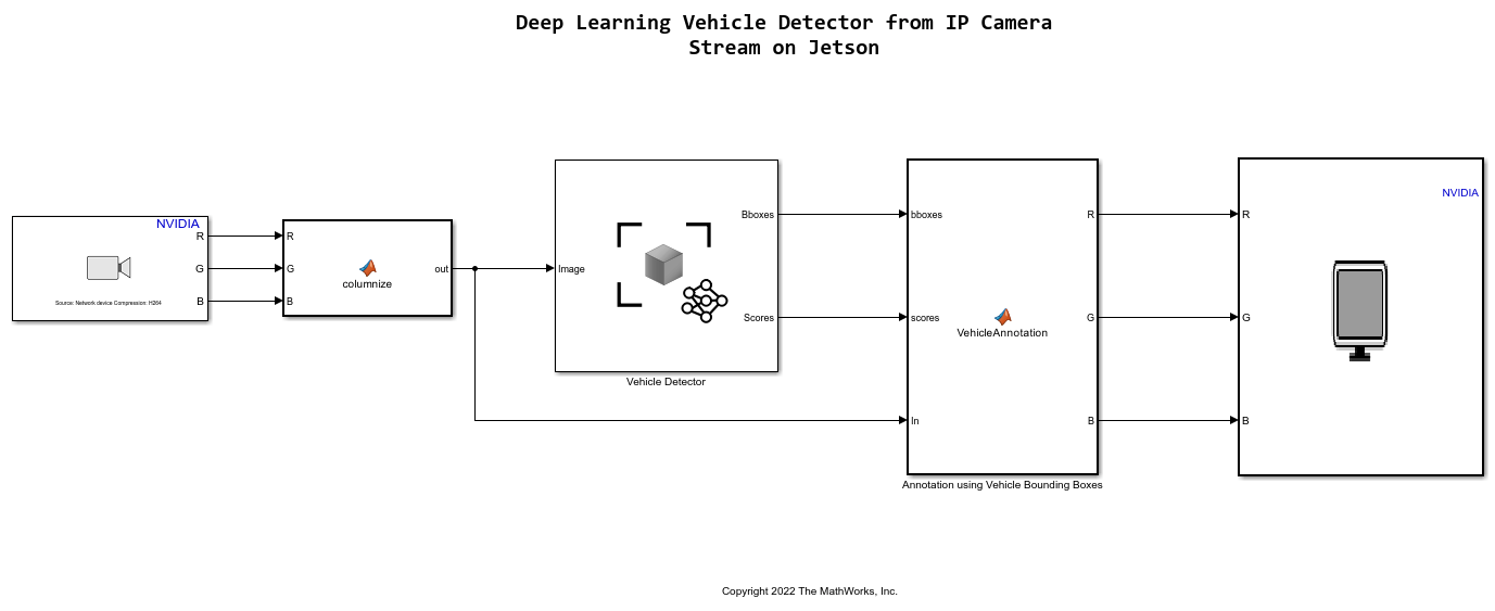 この例では、車両検出を実行する Simulink® モデルから、畳み込みニューラル ネットワーク (CNN) を使用して CUDA® アプリケーションを開発する方法を説明します。この例では、IP カメラ ストリームを入力として受け取り、フレーム内の車両を検出します。この例では、Computer Vision Toolbox™ の「YOLO v2 深層学習を使用したオブジェクト検出」の例の事前学習済み車両検出ネットワークを使用します。詳細については、YOLO v2 深層学習を使用したオブジェクトの検出 (Computer Vision Toolbox)を参照してください。