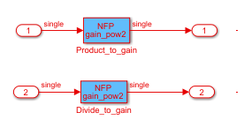 この最適化手法の例には、Product ブロックまたは Divide ブロックを Gain ブロックに置き換えることが含まれます。Product ブロックまたは Divide ブロックへの入力の 1 つが定数で、かつ 2 のべき乗である場合、コード ジェネレーターはそのブロックを Gain ブロックに置き換えます。コード ジェネレーターは、Product ブロックまたは Divide ブロック内の定数値を伝播し、Gain パラメーターを計算します。この最適化は、Native Floating Point モードの single データ型で動作します。