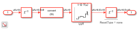 ルックアップ テーブルをブロック RAM にマッピングするために、LUT サブシステムに対して生成されたモデルにより、[遅延の長さ] が 1 で [ResetType] が none に設定された Delay ブロックが Lookup Table ブロックの直後に挿入されます。
