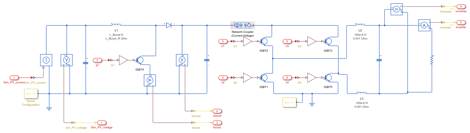 元のモデルでは、1 つのサブシステム内の 1 つのネットワークとして昇圧コンバーターとフル ブリッジ インバーターが含まれています。このモデルを確認するには、次のように入力します。
