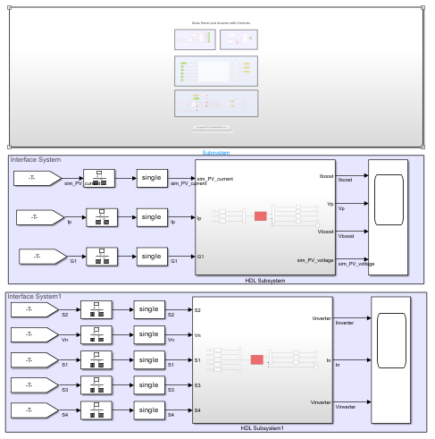 モデルには 2 つの HDL サブシステムが含まれています。HDL Subsystem ブロックは、昇圧コンバーターの状態空間方程式をモデル化します。HDL Subsystem1 ブロックは、フル ブリッジ インバーターの状態空間方程式をモデル化します。