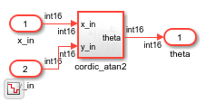 生成された Simulink モデルを開くには、コマンド ウィンドウのリンクをクリックします。このモデルは、現在のフォルダーに対して相対的なパス hdlimport/cordic_atan2 に保存されます。モデルをシミュレートしてシミュレーション結果を確認できます。
