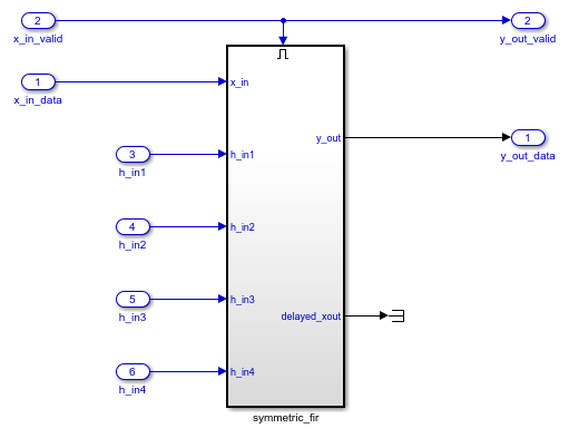 サブシステム DUT は、FPGA ファブリックをターゲットにするハードウェア サブシステムです。このサブシステム内で、symmetric_fir サブシステムはフィルター アルゴリズムを表します。入力端子 x_in_data と x_in_valid および出力端子 y_out_data と y_out_valid は、フィルターのデータ パス端子です。h_in1 などのその他の入力端子は、フィルター パラメーターを調整する制御端子です。
