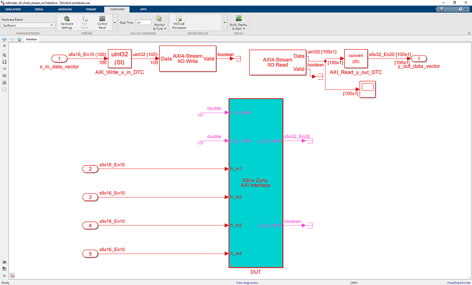 このモデルのデータ パス (x_in から y_out まで) は、スカラーの入力データを処理していることに注意してください。これは、ストリーミング インターフェイスに適しています。