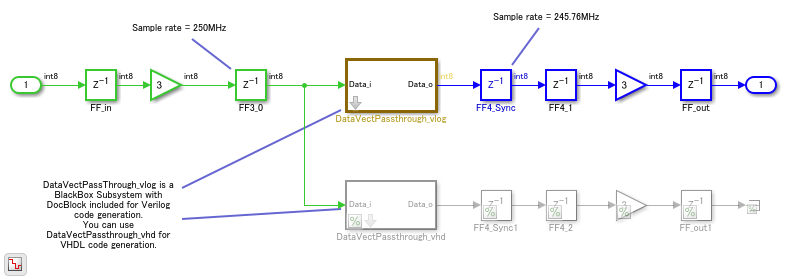 DocBlock が含まれる BlackBox Subsystem が表示されます。これは、パススルー実装の Verilog® コードに対応するテキスト ファイルです。DocBlock を開いて Verilog コードを表示できます。このサブシステムの出力が異なるサンプルレートで動作しているか、サブシステムの入力のサンプルレートとは異なるクロック領域にあることがわかります。サブシステムにはパススルー実装に等価の VHDL® が含まれるコメント アウトされたパスも含まれます。VHDL コードを生成するには、このパスのコメントを解除し、Verilog BlackBox 実装が含まれるパスをコメント アウトします。