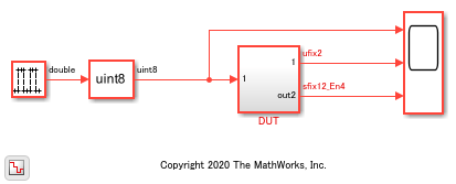 DUT サブシステムには、出力変数 out1 および out2 と内部変数 var1 の定義方法を示す Moore チャートが含まれています。out1 型は fi オブジェクトを使用して明示的に指定されており、out2 型と var1 型はモデル エクスプローラーで定義されています。