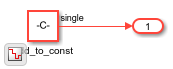 Constant_subsys2 で single データ型が使用されており、モデルで Native Floating Point モードが有効になっているため、この DUT の HDL コードを生成すると、Constant_subsys2 は定数演算を簡略化する最適化の候補になります。生成されたモデルを開いて確認すると、Constant ブロックが出力端子に直接接続されていることがわかります。