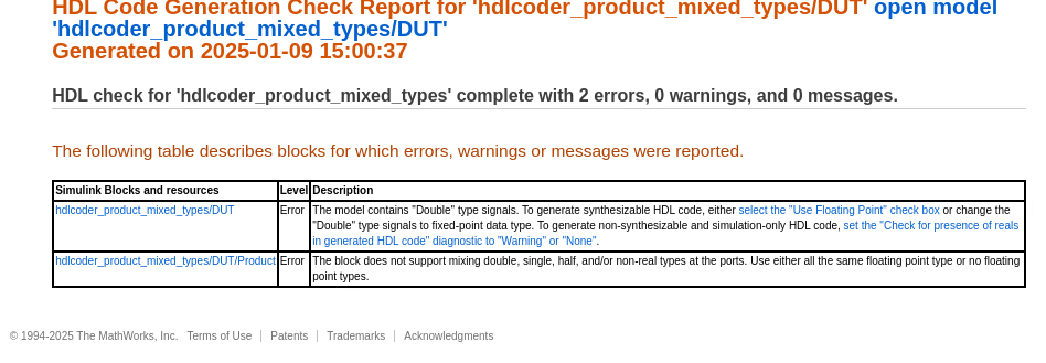 checkhdl('hdlcoder_product_mixed_types/DUT', ... 'TargetDirectory','C:/HDL_Checks/hdlsrc')