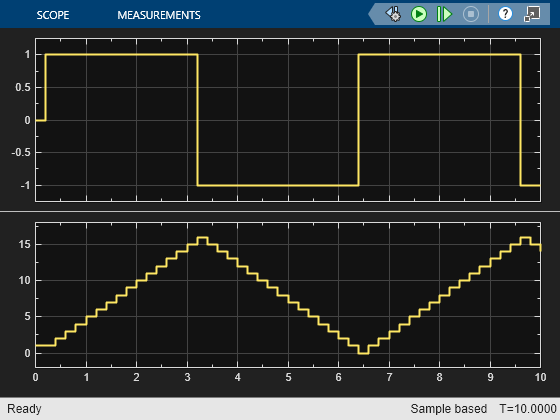 このモデルには、前述した最初のバージョンの fcn を使用する MATLAB Function ブロックが含まれます。この MATLAB Function ブロックの入力は、Sign ブロックと Sine Wave ブロックによって指定される矩形波です。この MATLAB Function ブロックは、各タイム ステップで、u の値を永続変数 n に追加します。