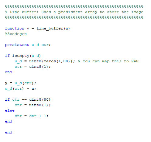 ml_subsys = 'hdlcoder_ram_mapping_matlab_function/HDL_DUT/Line Buffer'; hdlset_param(ml_subsys, 'MapPersistentVarsToRAM', 'on')