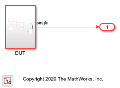 DUT サブシステムには、1 つの Atomic Subsystem ブロックが含まれます。Constant ブロックは、Terminator ブロックに接続している Add ブロックをもつサブシステムに対する入力です。