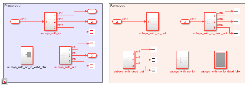 DUT サブシステムの Preserved と Removed というラベルが付いたボックス内にサブシステム ブロックが含まれます。Preserved 内のサブシステム ブロックは、DUT 出力の評価に影響する出力端子を少なくとも 1 つもつか、有効なブラック ボックス サブシステムをもつため、コード生成中に削除されません。アクティブな出力端子をもたない、その他のブラック ボックス サブシステムは、コード生成中に削除されます。