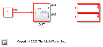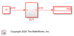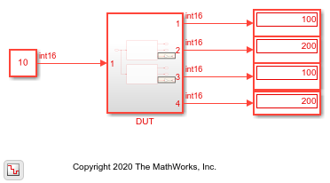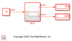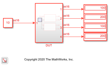 DUT サブシステム ブロックには、Switch ブロックと Enabled Subsystem ブロックが含まれます。Switch ブロックの制御入力に基づいて、Subsystem_2 からの false パスは出力に渡されます。EnabledSubsystem_1 ブロックの出力は Display ブロックで終端し、出力に積極的に影響することはありません。