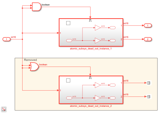 制御端子と入力信号を含む atomic_subsys_dead_out_instance_2 は、生成された HDL コードで削除されます。