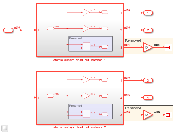 Atomic Subsystem ブロックのインスタンスが複数アクティブになっている場合、冗長なロジックの計算はサブシステム境界を超えず、ブロックは生成された HDL コードで保持されます。