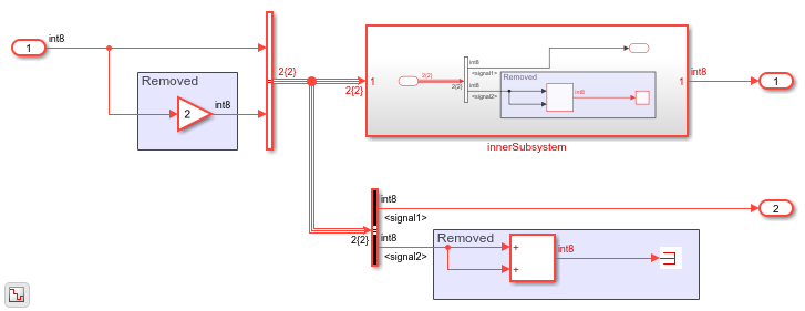 Atomic サブシステムは生成された HDL コードで保持されますが、Gain ブロックの計算はコードから削除されます。この場合、複数の Atomic サブシステムのインスタンスはアクティブであり、したがって冗長なロジックは端子境界全体から削除されます。
