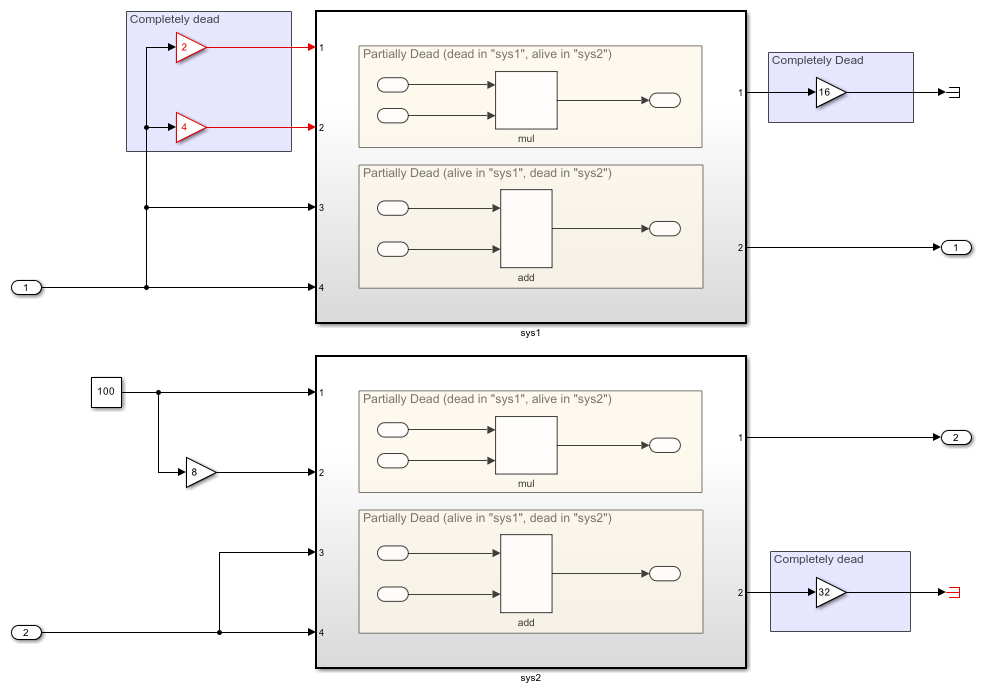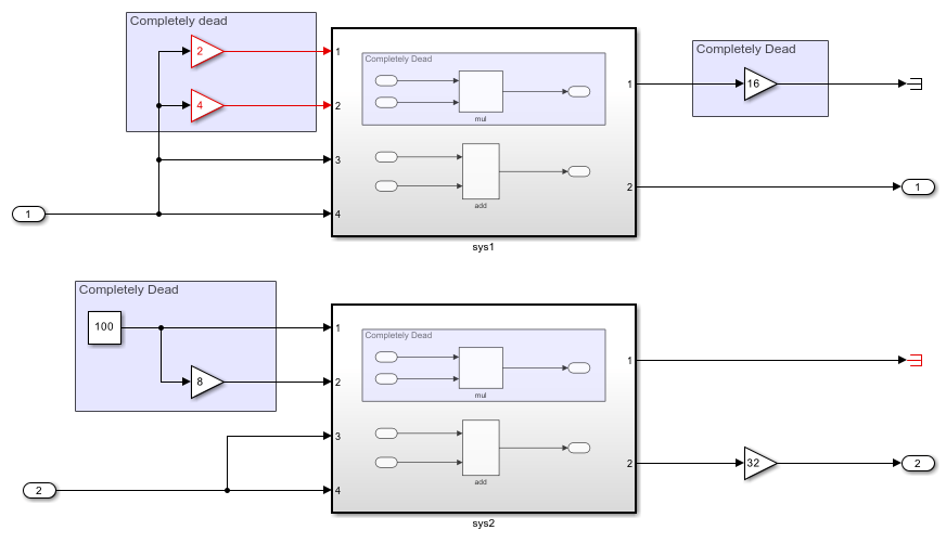 mul ブロックは sys2 で使用されているため、このブロックは部分的に接続済みとして分類され、ブロックのロジックは生成されたコードで保持されます。mul ブロックへの入力は完全に未使用であるため、生成されたコードから削除されます。