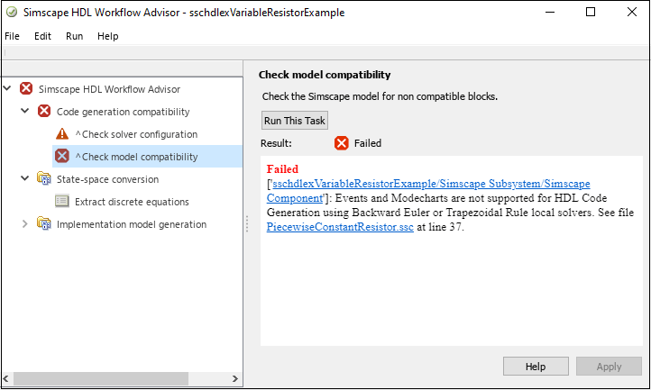Simscape HDL ワークフロー アドバイザーで、[コード生成互換性]、[モデルの互換性のチェック] タスクを右クリックして [選択したタスクまで実行] を選択します。このタスクは、Piecewise-Constant Resistor があるため失敗します。