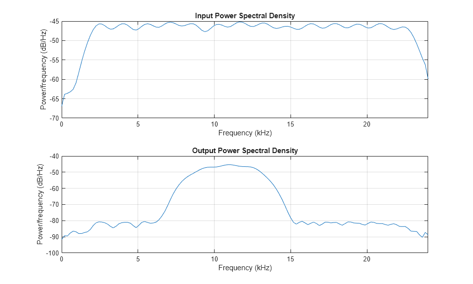 現在の例では、MATLAB テストベンチ 'mlhdlc_filter_tb' に設計関数 'mlhdlc_filter' の単一の呼び出しがあります。テストベンチは、浮動小数点の入力をもつ設計を呼び出し、浮動小数点の結果をプロット用に蓄積します。