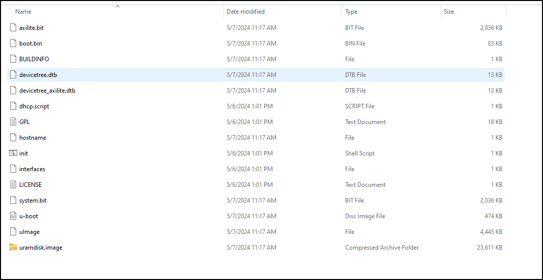 Linux イメージがビルドされると、生成されたイメージが <board_name>_sdcard_hdlcoder_<build_date>.zip という名前の ZIP ファイルとして /buildroot/output/<board_name>_linux_linaro/images フォルダーに格納されます。イメージ ファイルの内容を表示するには、<board_name>_sdcard_hdlcoder_<build_date>.zip ファイルを解凍します。