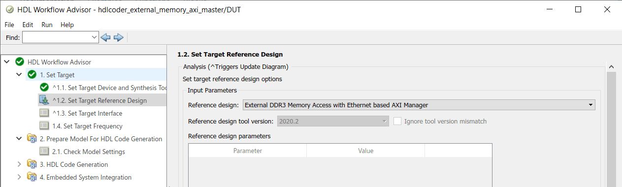 2. DUT サブシステム hdlcoder_external_memory_axi_master/DUT から HDL ワークフロー アドバイザーを起動します。ターゲットインターフェースの設定はモデルに保存されます。ステップ 1.1 では、ターゲット ワークフローは IP コア生成ワークフローであり、ターゲット プラットフォームは Xilinx Kintex-7 KC705 開発ボードです。