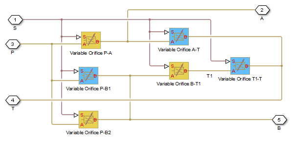 All Variable Orifice blocks are controlled by the same position signal, provided through the physical signal port S, but the Orifice orientation parameter in the block instances is set in such a way that positive signal at port S opens the orifices colored blue in the block diagram (orifices P-B1, A-T, and T1-T) and closes the orifices colored yellow (orifices P-A, B-T1, and P-B2). As a result, the openings of the orifices are computed as follows: