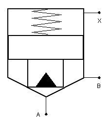 Pressures at port A and port B tend to open the valve, while pressure at the control port X, together with the spring, acts to close it. The model does not account for flow rates caused by poppet displacement and any loading on the poppet, such as inertia and friction. The valve remains closed as long as the aggregate pressure force is lower than the spring preload force. The poppet is forced off its seat as the preload force is reached and moves up proportionally to pressure increase until it passes the full stroke. Hydraulic properties of the gap between the poppet and the seat are simulated with the Variable Orifice block.