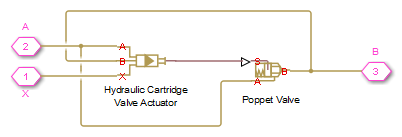 Pressures at port A and port B tend to open the valve, while pressure at the control port X, together with the spring, acts to close it. The model does not account for flow rates caused by poppet displacement and any loading on the poppet, such as inertia and friction. The valve remains closed as long as the aggregate pressure force is lower than the spring preload force. The poppet is forced off its seat as the preload force is reached and moves up proportionally to pressure increase until it passes the full stroke. Hydraulic properties of the gap between the poppet and the seat are simulated with the Poppet Valve block.