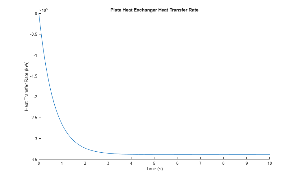 This figure shows the rate of heat transfer from the hot side to the cold side through the heat exchanger. The heat transfer from the cold side to the hot side is equal in magnitude, but positive. The heat transfer rate starts at 0 W because the initial temperatures on both sides of the heat exchanger are equal.