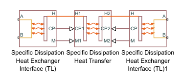 The block is a composite component. A Specific Dissipation Heat Exchanger Interface (TL) block models the thermal liquid flow on side 1 of the heat exchanger. Another models the thermal liquid flow on side 2. A Specific Dissipation Heat Transfer block captures the heat exchanged across the wall between the flows.