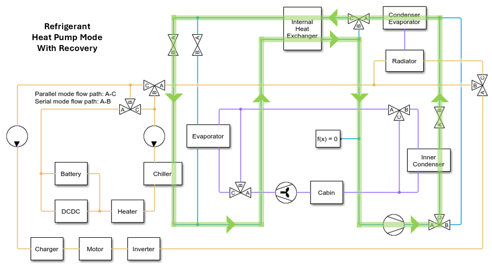 The figure below highlights the refrigerant loop in heat pump mode with heat recovery. While in heat pump mode, if the coolant temperature is above 20 degC, the chiller evaporator bypass valve directs refrigerant to the chiller to absorb heat from coolant before returning to the accumulator and compressor. This flow path allows the system to reuse some of the waste heat from the batteries and powertrain, which improves the heat pump mode cycle efficiency by reducing the pressure difference that the compressor needs to maintain.