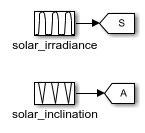 モデルの入力は、ポンプ流量と、放射照度や入射角に関する太陽光の変数です。入力は、24 時間周期のサイクルに従うため、反復列ブロックを使用して定義されています。