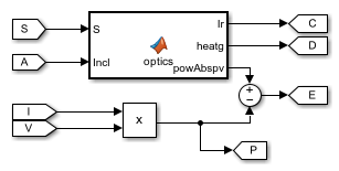 これは MATLAB Function ブロックで構成されており、2 つの太陽光入力と、3 つの出力 (PV 電池に透過する放射照度、ガラスが吸収する熱、PV 電池が吸収する放射パワー) をもちます。その一部は電力 (V*I) に変換され、残りは熱となって PV 電池に吸収されます。