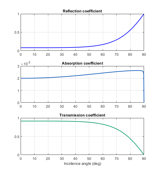 以下は、入射角の関数における光学係数 rp、rs、r および t の例です。