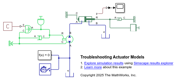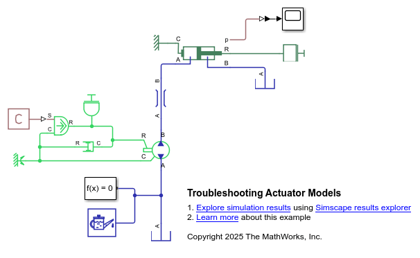 This example shows how to troubleshoot problems in a model that contains actuator blocks and cannot converge during simulation. Blocks that interface with the mechanical domain, like actuators, can cause solver problems. These problems arise because the mechanical domain can introduce variables that cause a high differential index, which the solver cannot always overcome. A high differential index occurs when there are not sufficient degrees of freedom in the model. This behavior can cause issues where a model makes physical sense, but generates errors when the solver cannot converge.