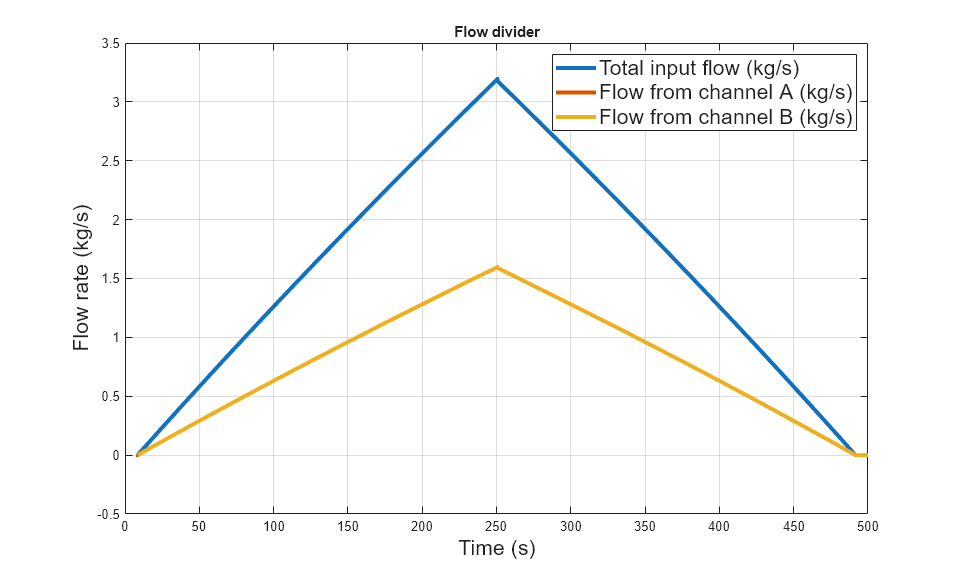 次の図は、テスト ハーネスを含む分流器のモデルを示しています。モデルの出力は、特定の入力流量でチャネル A とチャネル B を通る流量のプロットです。