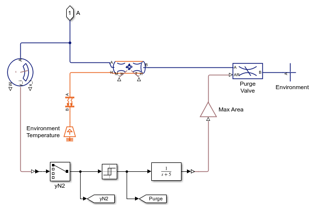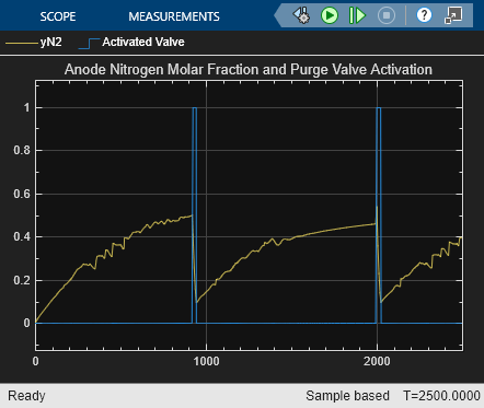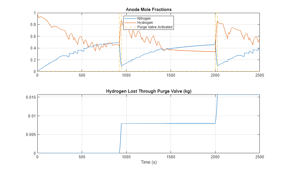 次のプロットは、燃料電池アノードの窒素と水素のモル濃度を示しています。窒素の濃度が高くなるほど水素の濃度が低くなり、燃料電池の性能が低下します。このシステムには、アノードの水素濃度を高く維持することを目的としたパージ バルブがあります。このバルブは、アノードの窒素モル濃度が 50% を超えると開き、10% に戻ると閉じます。パージ バルブが開いて窒素を放出すると、残念ながら水素も放出されます。したがって、燃料電池のパージ バルブには、通常、慎重に設計された制御戦略が必要です。