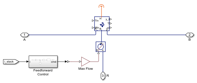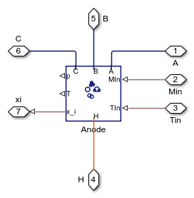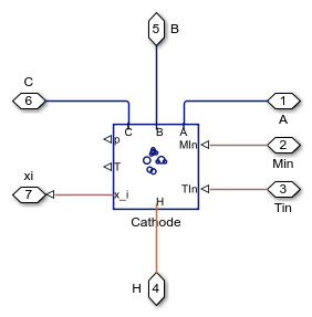 アノードとカソードの気体チャネル ブロックの出力端子 xi により、燃料電池反応のモデル化に必要な気体モル分率が提供されます。このブロックは、アノードとカソードからのそれぞれ H2 と O2 の除去と、化学反応による H2O の生成をモデル化します。水蒸気は MEA を通過します。反応により生成された熱は熱端子 H を経由して、接続されている Thermal Mass ブロックに送られます。実装の詳細については、コード内のコメントを参照してください。