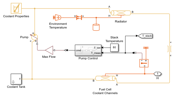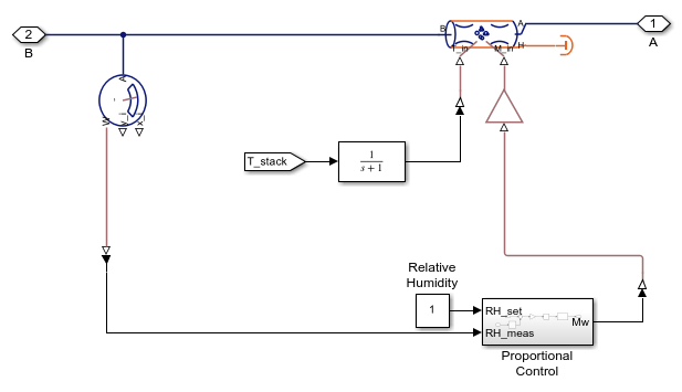 さまざまな負荷条件で効率的な動作が確保されるよう、燃料電池スタックの温度と相対湿度は最適なレベルで維持されなければなりません。温度が高くなると熱効率は上がりますが、相対湿度は下がるため、膜抵抗が高くなります。そのため、このモデルでは、燃料電池スタックの温度は摂氏 80 度に維持されています。冷却システムは電池間で冷却水を循環して熱を吸収し、ラジエーターによって環境に熱を放出します。加湿器は気体を水蒸気で飽和させることにより、膜を水和状態にし、電気抵抗を最小化します。