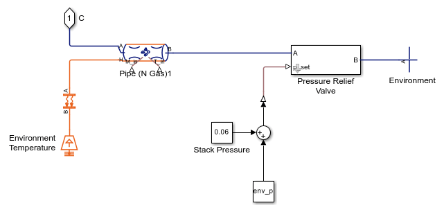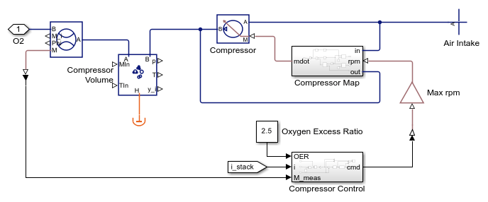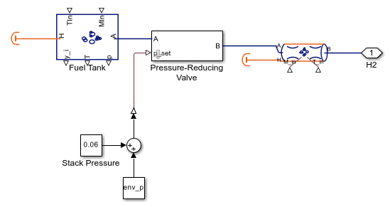カソードには窒素 (N2)、水蒸気 (H2O)、酸素 (O2) が含まれ、環境からの空気を表しています。燃料電池が酸素不足にならないように、コンプレッサーが空気を指定された速度で燃料電池スタックに送ります。圧力安全バルブにより、スタック内の圧力は約 0.16 MPa で維持され、排気は環境に放出されます。