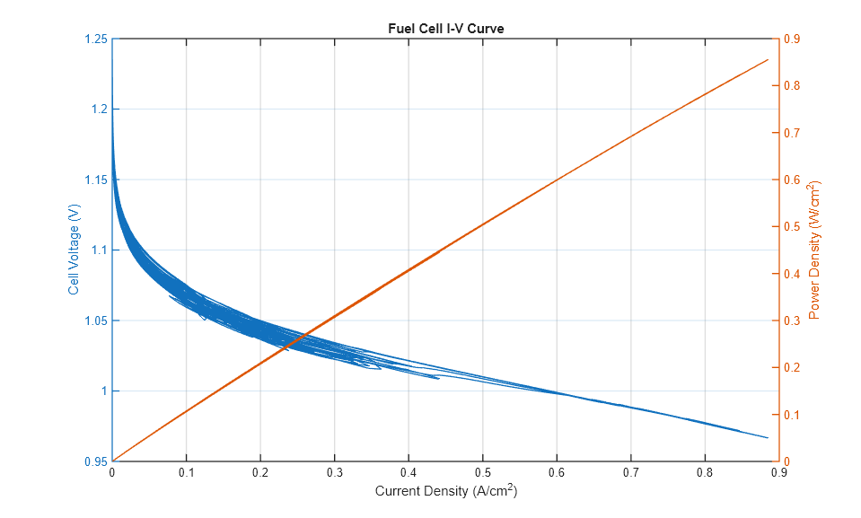 次のプロットは、スタックの燃料電池の電流-電圧 (i-v) 曲線を示しています。電流が上昇すると、電極の活性化損失により電圧の初期低下が発生し、その後、オーム抵抗により電圧が徐々に低下します。最大電流付近では、気体の移動に関連する損失により、電圧の急激な低下が発生します。