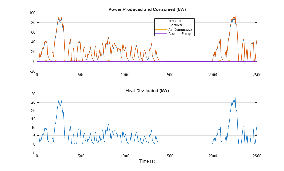 このプロットはまた、燃料電池スタックで生成される過剰な熱も示しており、これは冷却システムで除去しなければなりません。燃料電池スタックで生成される最大電力は 95 kW です。