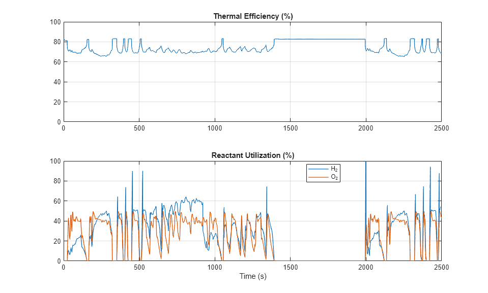 反応物の利用率は、燃料電池スタックに流入する反応物 (H2 と O2) のうち、燃料電池で消費されたものの割合です。利用率が高いと、燃料電池を流れる気体は効率的に使用されますが、反応物の濃度が下がるため生成される電圧は低下します。未消費の O2 は環境に排出されますが、未消費の H2 は無駄にならないようアノードに再循環されます。汚染物質を取り除くために H2 は定期的に除去されます。
