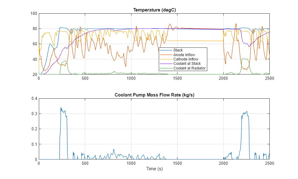 温度が高くなると相対湿度が低下して膜抵抗が高くなるため、最適な温度の維持は燃料電池の動作にとって不可欠です。このモデルでは、冷却システムは冷却水ポンプ流量の単純な制御により操作されます。プロットは、冷却水が燃料電池スタックから熱を吸収した後の温度と、冷却水がラジエーターで熱を放出した後の温度を示しています。