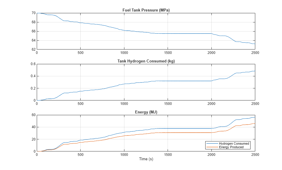 次のプロットは、動作中に使用された水素の質量と、これに対応する水素タンク圧力の低下を示しています。消費された水素燃料のエネルギーは、電気エネルギーに変換されます。