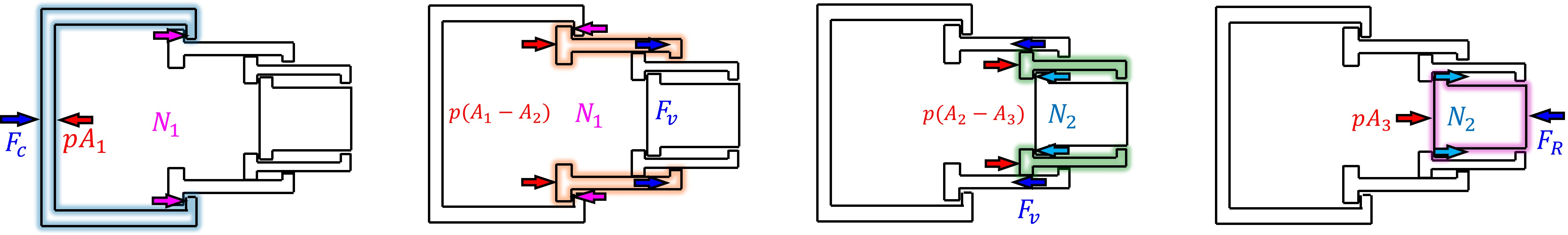 where and are the forces at port C and R, respectively, and represents a hard-stop force, and is the viscous force associated to the movement of the second stage. The sum of all equations gives . The diagram shows how the forces on the free body diagrams manifest across the network.