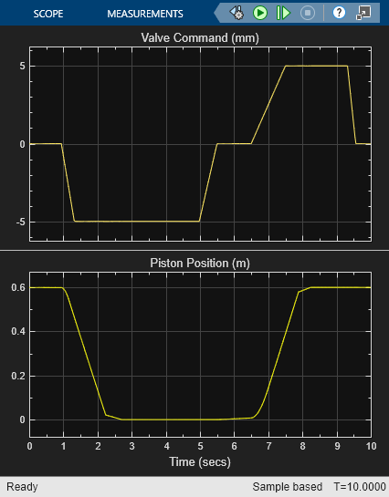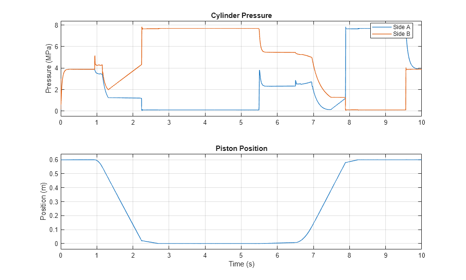 These plots show the pressures in the cylinder and the position of the piston, whose stroke is 0.6 m. The piston smoothly retracts to the hard stop at the end of cylinder casing and smoothly extends back to its full stroke length.