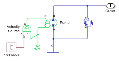 この例では、可変容量型ポンプと固定容量型モーターで構成される静油圧変速機システムを示します。ポンプ側の 2 つの補充バルブ (チェック バルブ) とチャージ ポンプ、モーター側の 2 つの圧力安全バルブにより、ポンプとモーターの間のパイプが接続されます。モーターは、慣性、粘性摩擦、時変トルクで構成される機械的負荷を駆動します。正と負の両方のポンプ流量でポンプの変位を変えてシステムをテストします。