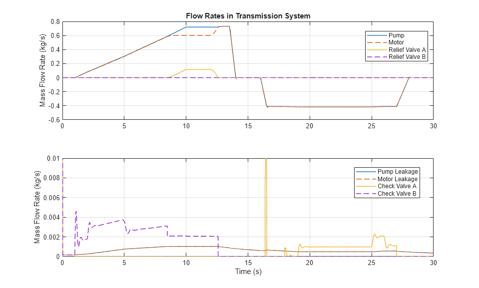 次のプロットは、変速機システムのポンプ、モーター、バルブを通る質量流量を示しています。チェック バルブを通過するチャージ ポンプからの流量により、ポンプとモーターのケーシングからの外部漏れが補正されます。